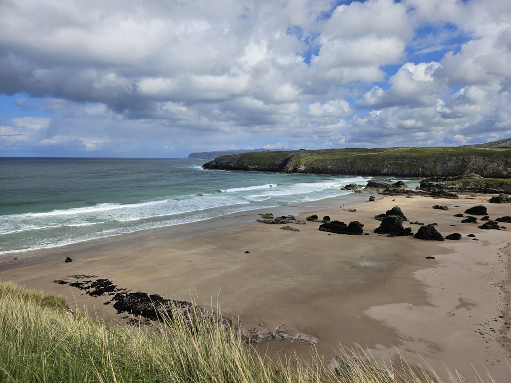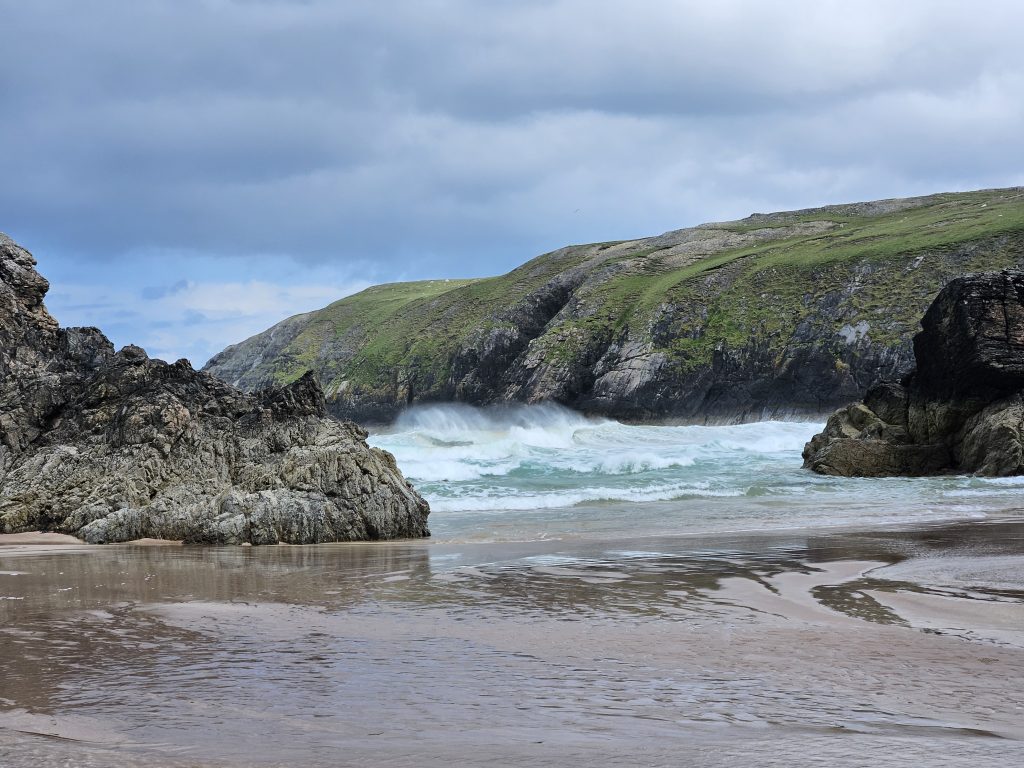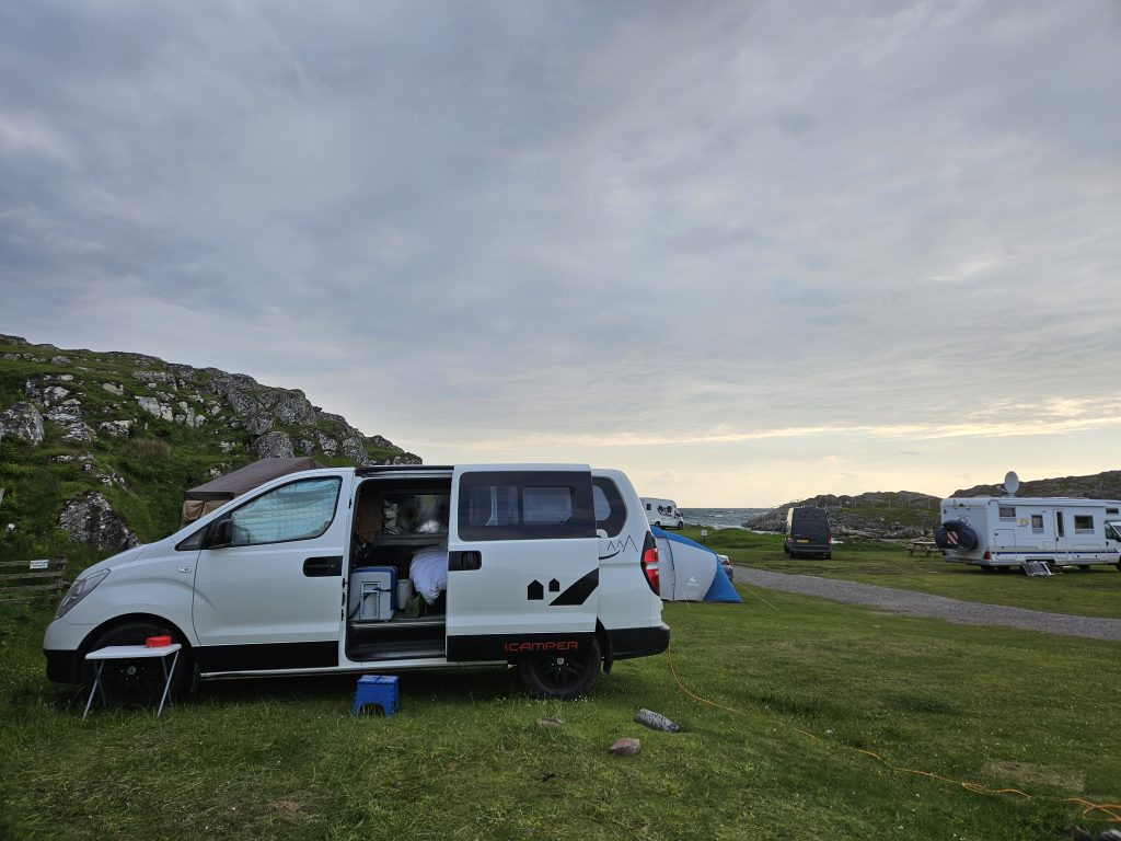 Our end goal for that night was Durness, the most northwesterly village on the British mainland. The village sits above Sango Sands Bay and I had found a campsite there where you could just chance your luck to get in. The views from here were breathtaking, turquoise seas, large rolling waves and rocky cliffs. I was in my element!