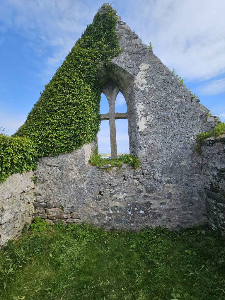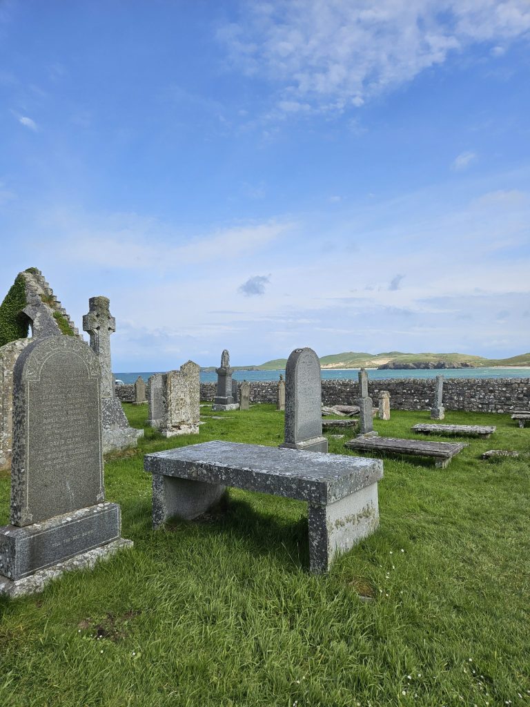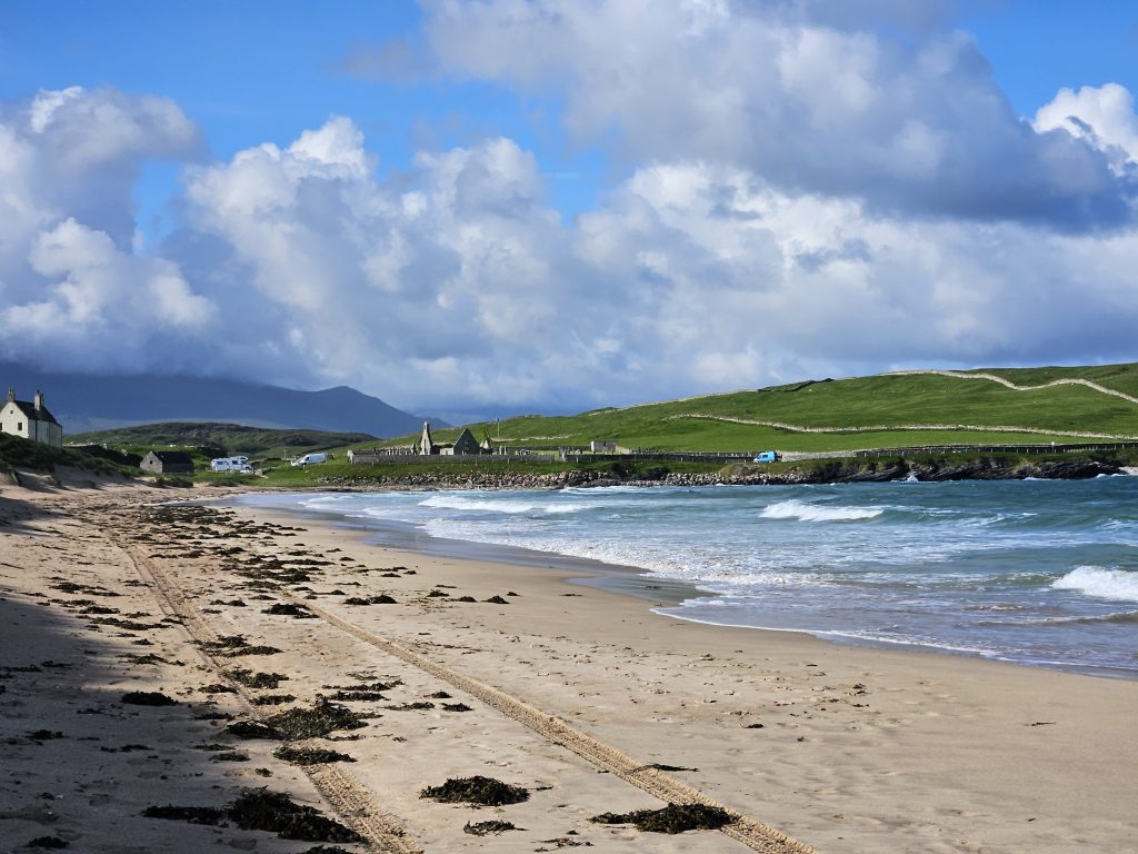 I wanted to go to Balnakiel Bay, a mile northwest of Durness. The sun was shining by now and the sea was a brilliant Mediterranean turquoise colour. This is my kind of place and all Tim could get out of me was “Oh wow!” and “look at that!” There is a walk around to the headland of Faraid Head and Cape Wrath but that would’ve taken 3-4 hours, which we didn’t have time for. Therefore we stuck to stomping along the sandy beach, up through the other-worldly sand dunes and back again, taking about 1.5 hours. We had parked next to an old fishing community’s ruined church and it was a very special place, so full of atmosphere. I could’ve stayed for hours! There is also a craft village nearby and a cafe called Cocoa Mountain, where we enjoyed croissants and delicious hot chocolate before continuing our journey.