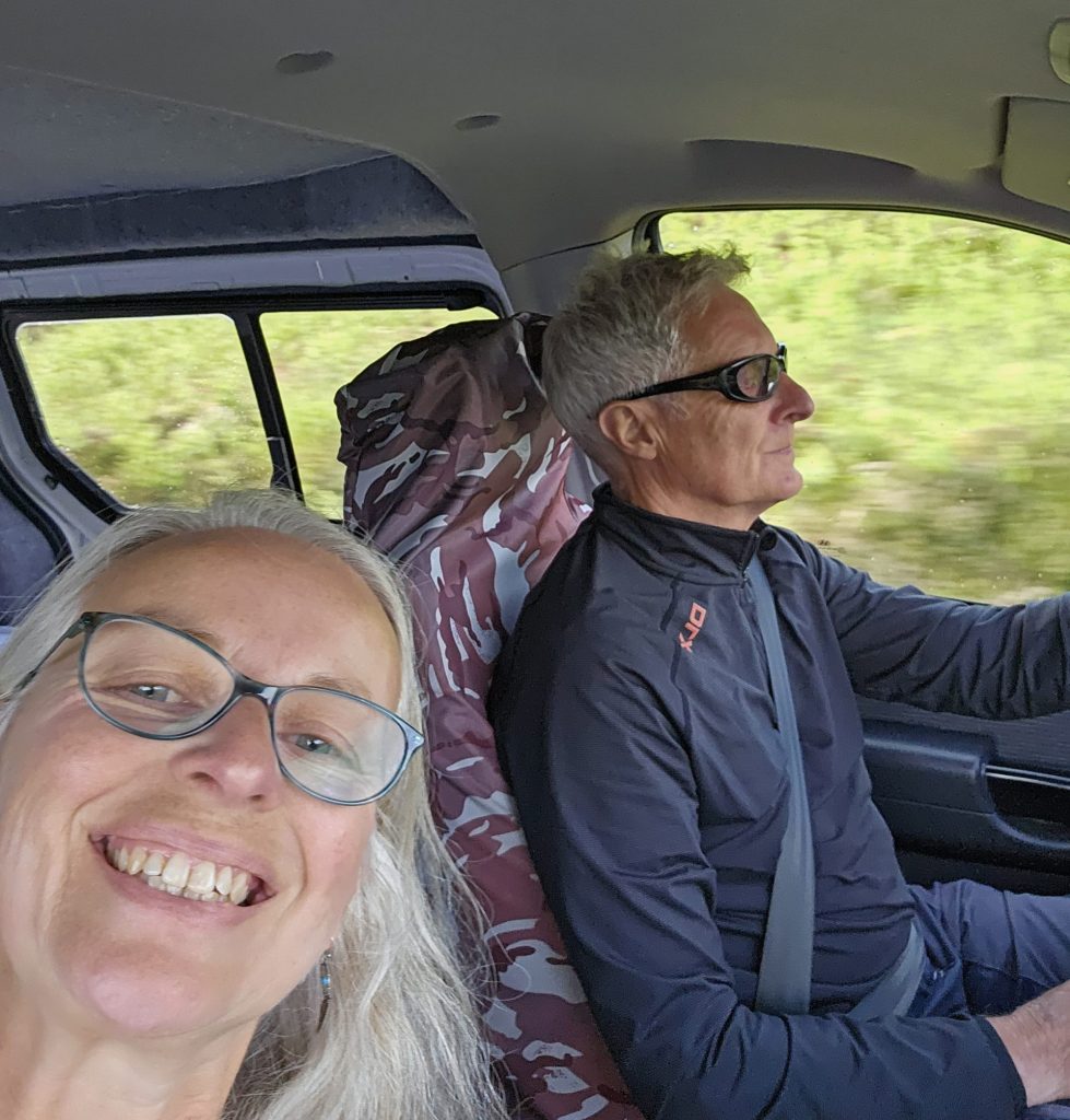 Waking to the sound of the sea and the gentle pattering of drizzly rain, we got up and showered early. Making tea wasn’t an option as our milk had gone off, so it was black coffee for us.